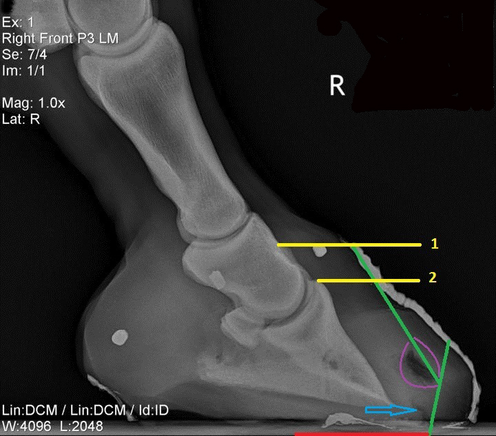 It is critical to trim a laminitic foot to a normal alignment of the hoof capsule and the internal structures with the aid of radiographs. If radiographs show coffin bone rotation or descent, the horse will need a realigning trim. The purpose is (1) to relieve abnormal forces that would do even more damage; and (2) to encourage correct hoof wall growth. This involves the trimming required to make the hoof wall parallel with the edge of the coffin bone again, realigning the structures. Over time, internal structures that work for the horse for healthy blood perfusion and energy dissipation may be restored.