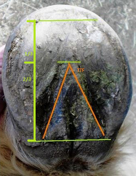 By understanding the basic proportions of the foot, one can see that the toe and frog are stretched and can take appropriate trimming measures to start the realignment of the hoof capsule with the coffin bone.