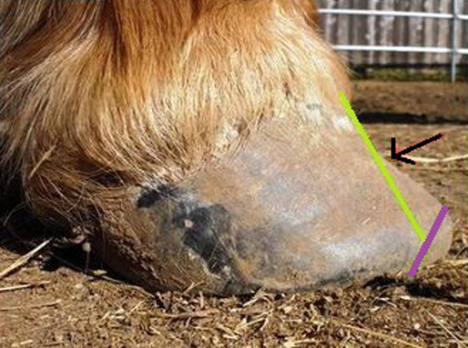 In photo 2, lateral assessment of this same foot also shows the long toe. The upper third of the wall is aligned with the current position of the coffin bone. There is a point of angle change in the toe wall (black arrow), classic with a history of founder. One fundamental aspect of the realigning trim backs the toe so that it is in line with the current position of the coffin bone (purple line). This reduces the pull or leverage on the lamina during break over by allowing the coffin bone to break over correctly.