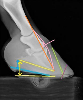 The hoof in Photo 4 demonstrates both bony and capsular rotation. In a healthy foot, the palmar angle, or back of the coffin bone (yellow arrow), usually sits at about 5 degrees (+/-) to the ground. The bony column is aligned (orange), with no knuckling forward (pink) or dipping back. By lowering the heels to the blue line, another fundamental aspect of a realigning trim with bony rotation, the bones will be "derotated" (pink arrow) and the palmer angle returned to about 5 degrees (blue arrow). It usually happens as quickly as that.