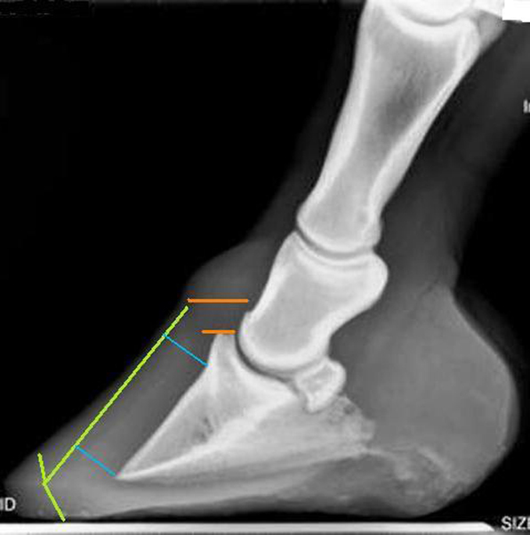 Radiographs in photo 3 confirmed the long toe flare which perpetuated the capsular rotation (green lines). The degree of separation between the coronet band and the extensor process (orange lines) demonstrates a moderate amount of distal descent. It is probable that the diminished support by the out-of-balance hoof capsule in relation to the coffin bone was enough to allow the bony column to descend.